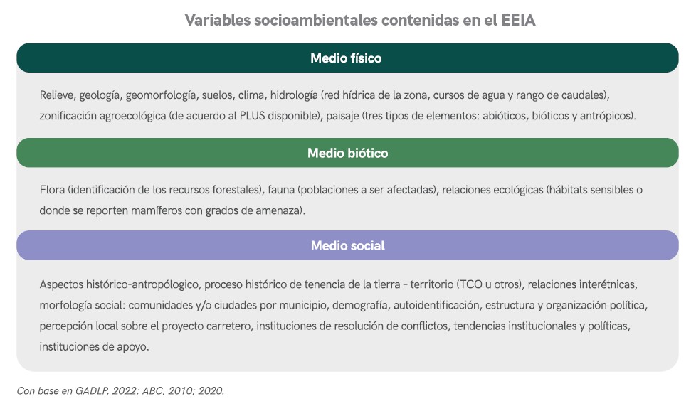 La Ley 1333 y el Reglamento de Prevención y Control Ambiental (Art 7 y 20) tiene como máxima herramienta de control ambiental el Estudio de Evaluación de Impacto Ambiental (EEIA) para actividades, obras y proyectos (AOP) con categoría 1: por ejemplo, la carretera San Buenaventura – Ixiamas cuenta con un EEIA, mientras el proyecto de carretera por el TIPNIS contaba con una Evaluación Ambiental Estratégica (EAE), un documento complementario al EEIA.
