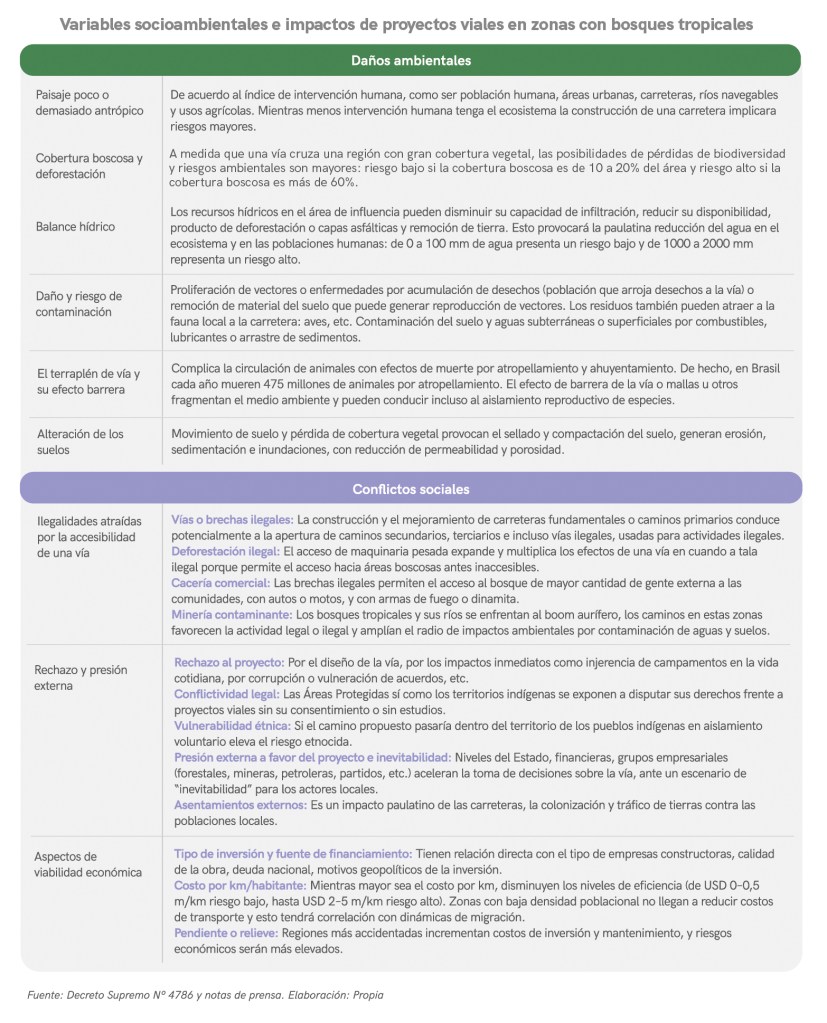 Aportando a estos estudios de corte más economicista, expondremos acá una matriz integral con los datos hallados en el trabajo de campo realizado en tres vías del norte amazónico de Bolivia: falta de procesos de control territorial, ocurrencia de ilegalidades como asentamientos o tráfico de tierras o cacería ilegal, conflictividad social y presión para ceder al proyecto o negociarlo ante incertidumbres o inevitabilidad, y –evidentemente- el avance de actividades lucrativas para ciertos grupos sociales: explotación de madera y minería provocados por la accesibilidad.