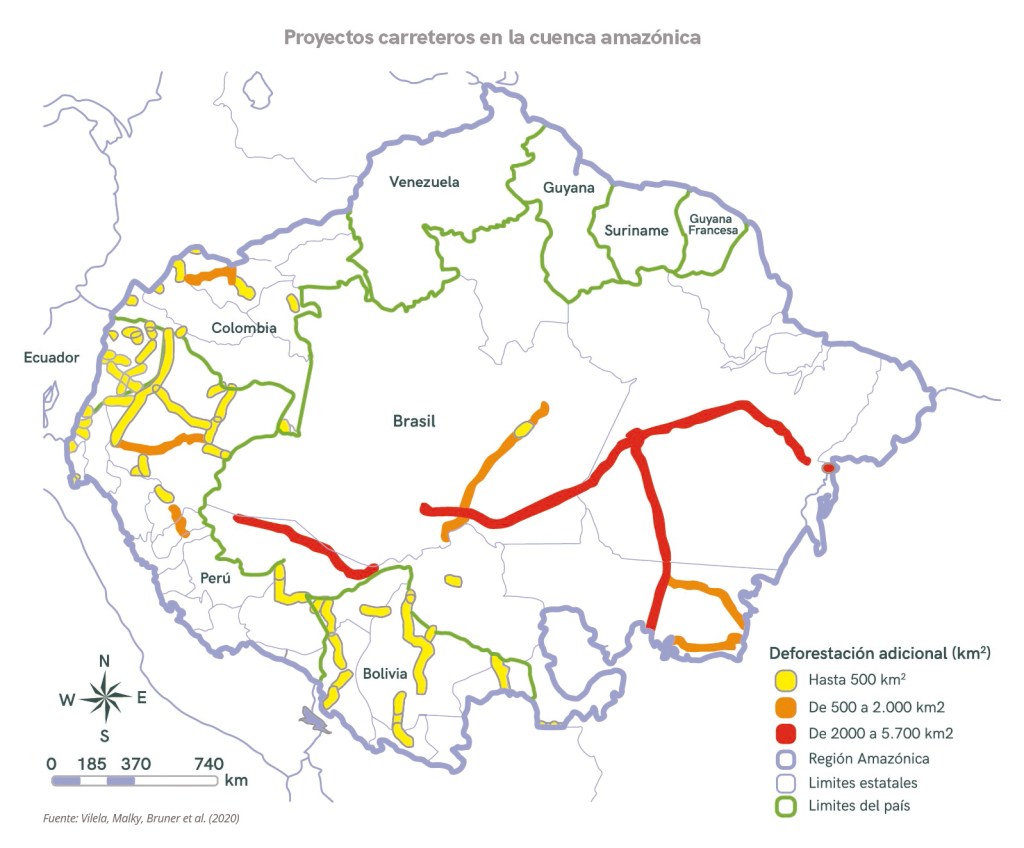 Para entender la magnitud de las obras de infraestructura vial, Vilela, Malky, Bruner et al. (2020) realizaron una investigación sobre 75 proyectos carreteros en la zona amazónica de Brasil, Bolivia, Colombia, Ecuador y Perú. Estas vías en la Amazonía causarán una deforestación de al menos 2.4 millones de hectáreas de bosques en 20 años. Casi el 20 % de las carreteras estudiadas infringen normas relativas a estatutos ambientales, consulta previa y/o pública y derechos indígenas: tres proyectos viales atravesarán territorios de pueblos indígenas en aislamiento voluntario en Ecuador y Colombia. A esto se suman conflictos sociales de rechazo a los diseños de vías.