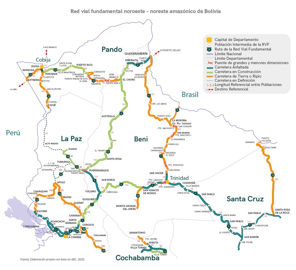 El Plan de Desarrollo Económico y Social (PDES) 2021-2025 tiene como meta llegar a 10.500 kilómetros (km) de caminos construidos y pavimentados en la Red Vial Fundamental (RVF), 47 km de puentes y accesos y 13 mil km de conservación vial hasta 2025. La Autoridad Boliviana de Carreteras (ABC) proyectó hasta 2020 realizar 5.995 kilómetros de obras viales priorizando la frontera amazónica con una inversión de USD 11.682.877 millones (PEI ABC, 2016).