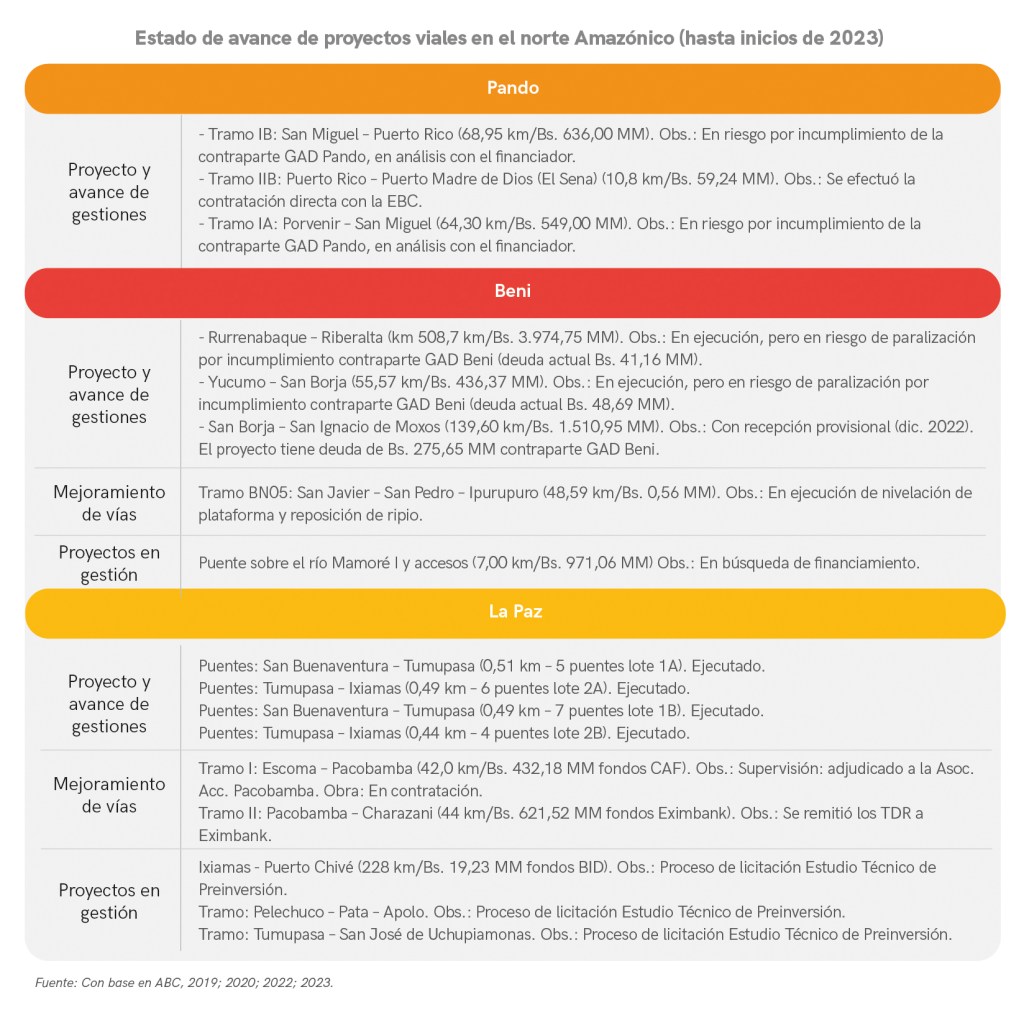 Si se ve el cuadro que está a continuación, llama la atención que el plan de infraestructura se viene ejecutando de forma segmentada, pero poco a poco concretiza la política llamada “marcha hacia el norte”. Lo primero que llama la atención es la denominación de “subtramos”, pedazos recortados de los tramos integrales, luego está la separación de la construcción de puentes de los terraplenes, o el disimulo de los diseños de nuevas carreteras bajo la etiqueta de “mejoramiento” o “conservación” de camino. Todo esto reconfigura y complica el seguimiento a los estudios ambientales y su categorización, pues hay que recordar que, en el caso de la carretera por el Territorio Indígena y Parque Nacional Isiboro Sécure (TIPNIS), el Ministerio de Obras Públicas logró construir tres puentes en el Área Protegida con la justificación de que estas obras tenían una categorización 3 por lo que –supuestamente- no tendría impactos (Cauthin, 2022). Estos puentes -construidos independientemente de los terraplenes- viabilizaron la apertura del camino apto para vehículos, por lo que el Consejo Indígena del Sur (Conisur) rechazó la construcción de un cuarto puente en 2022, al evidenciar sus impactos y las vulneraciones a sus derechos (Cauthin, 2023).