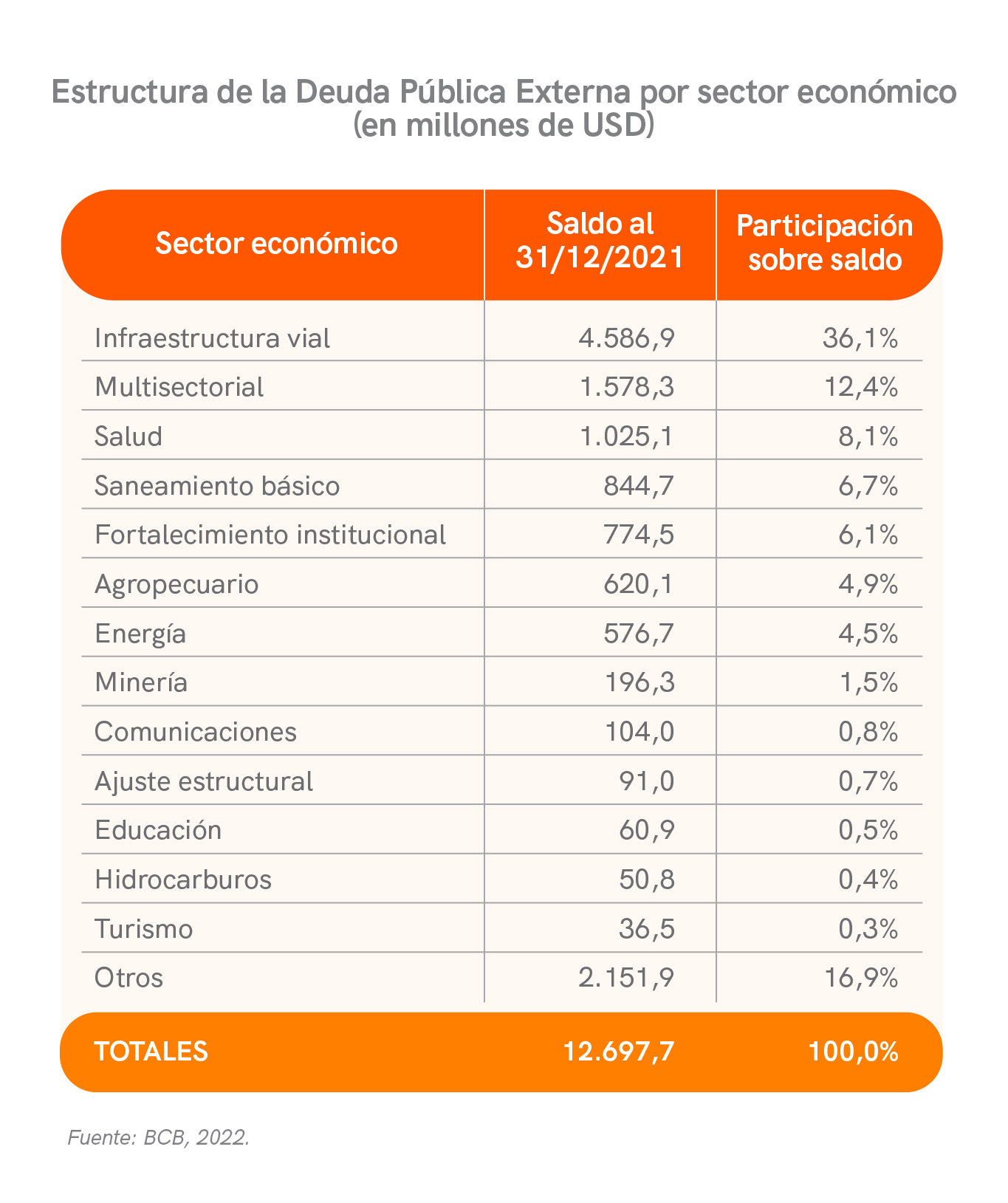 Los sectores de inversión más importantes dentro la deuda pública externa son: infraestructura vial con el 36 % de la deuda (USD 4.587 millones), el multisectorial con el 12 % (USD 1.578 millones), el sector de salud con 8 % (USD 1.025 millones), saneamiento básico con 6.7 % (USD 845 millones), fortalecimiento institucional con 6 % (USD 774 millones), sector agropecuario con 4.9 % (USD 620 millones) y energía con 4.5 % (USD 577 millones), entre los más importantes.