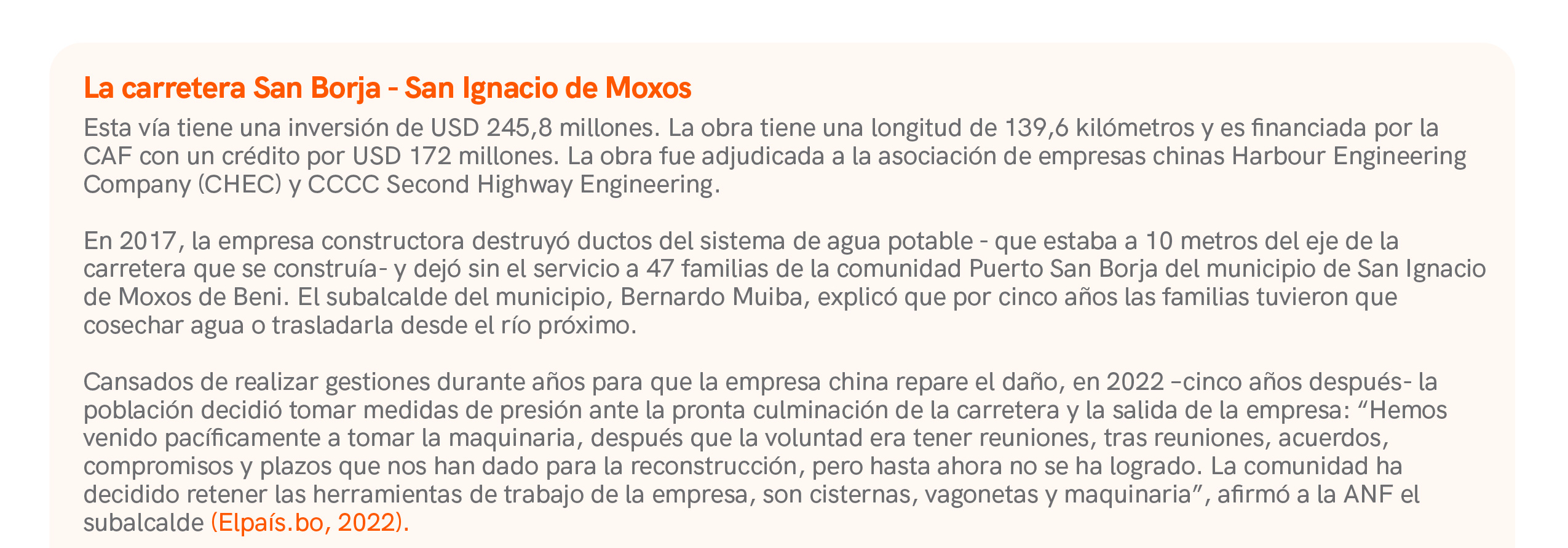 En un contexto de emergencia frente a la sequía que vive Bolivia y el avance de la frontera agropecuaria en la Amazonía, poco se sabe de las políticas ambientales y sociales de estos bancos internacionales y de qué manera efectiva estas financieras aseguran o no la protección de bienes comunes sensibles como las fuentes de agua. De hecho, los últimos años se han hecho más constantes las denuncias y polémicas sobre megaproyectos por falta de criterios ambientales que protejan zonas de recarga hídrica como áreas protegidas, cuencas, además de ríos, acuíferos, lagunas, etc. Claro ejemplo son el tramo Las Cruces – Buena Vista –financiado por la CAF- que vulnera la protección de los acuíferos de Santa Cruz además del parque Amboró; de la misma manera se puede mencionar la carretera San Buenaventura – Ixiamas, financiada por el BM, que “puenteó” 22 ríos en menos de 100 kilómetros y donde, según las versiones de pobladores, no se aplicaron medidas de protección para mantener la conducta hídrica de los ríos, la accesibilidad para las comunidades que se proveen de esos arroyos aguas abajo, ni se mejoraron las condiciones de conexión de agua de las comunidades sobre la carretera o de los poblados intermedios (Cauthin, 2023), idéntico problema se enfrenta en la carretera Riberalta – Rurrenabaque, financiada por Exim Bank de China (Odpib, 2023).
