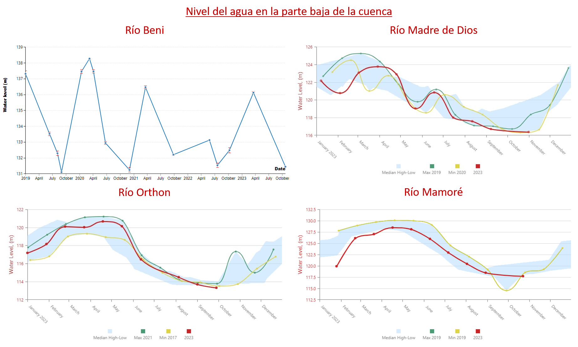 Mediciones hechas tanto en la parte alta como la parte baja del río Beni evidencian importantes anomalías en el nivel del agua. En la parte alta del río (en las cercanías de Rurrenabaque) en el mes de agosto el nivel del agua registró 176.19 metros, el nivel más bajo de los últimos tres años. Mientras que, en la parte baja (a 120 kilómetros de Riberalta) el nivel del agua llegó a 131.45 metros, valores muy similares a los extremos registrados en 2021 y 2019.