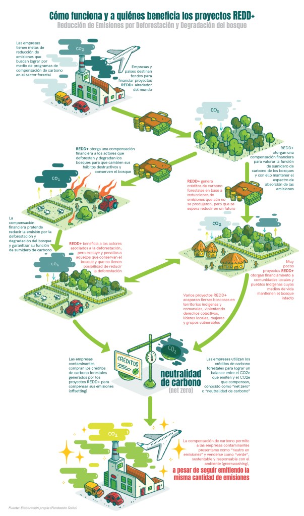 A cambio de esta “compensación financiera” para reducir la deforestación y fomentar la conservación de los bosques, los países y empresas contaminantes pueden obtener Certificados de Reducción de Emisiones (CRU). De esta manera, REDD+ terminó de consolidar el esquema de offsetting para que países y empresas contaminantes puedan –por medio de pagos basados en resultados– financiar proyectos de compensación y adquirir créditos de carbono forestales (créditos de carbón) en los mercados de carbono; facilitando así alcanzar sus objetivos de reducción de emisiones (Global Forest Coalition, 2020).