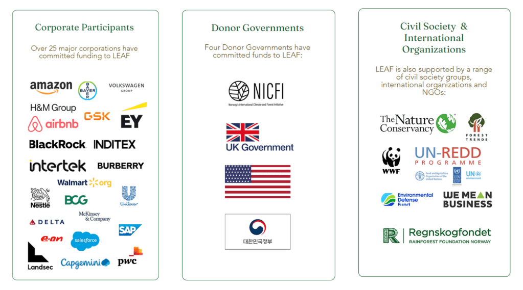 Lanzada a principios de 2021 durante la Cumbre de Líderes Sobre el Clima, la Coalición LEAF se constituye en una alianza voluntaria de gobiernos y empresas privadas con el fin de proporcionar pagos basados en resultados a países en vías de desarrollo “comprometidos con la protección de sus bosques tropicales” y así “contribuir a detener la deforestación y la degradación de los bosques tropicales y subtropicales para 2030”[2].