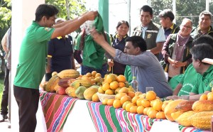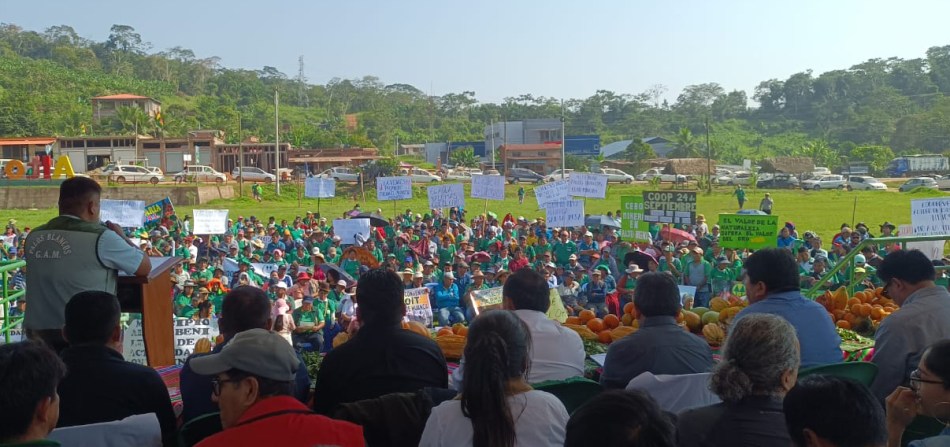 Son las 10 de la mañana y casi no hay nubes en el cielo. Más de trescientos dirigentes de organizaciones agroecológicas campesinas, indígenas y de mujeres de los municipios de Alto Beni y Palos Blancos se han dado cita para recibir al vicepresidente David Choquehuanca, al viceministro de medio ambiente Franz Quispe, y al director departamental de la AJAM de La Paz Álvaro Antezana. La mesa de la testera está llena de plátanos, cítricos, cacao y toda clase de productos agrícolas del lugar.