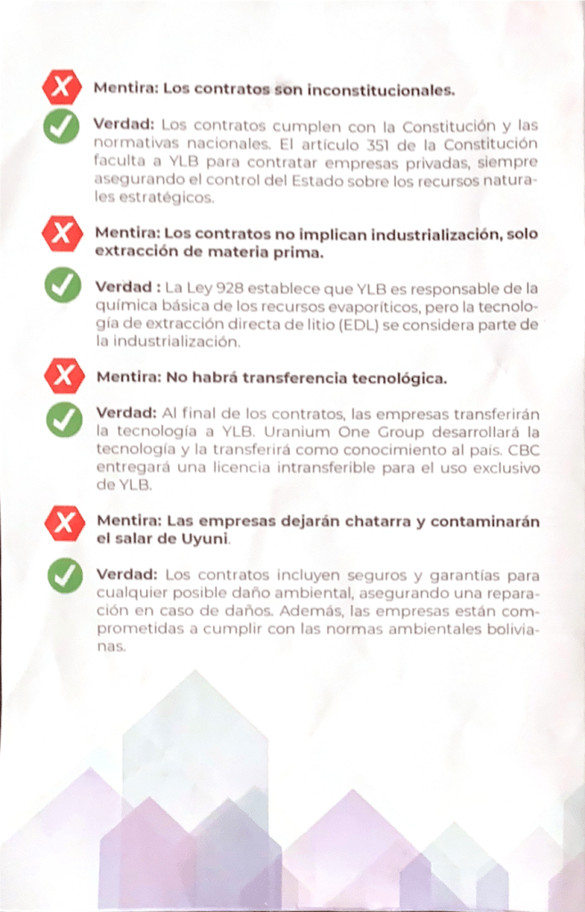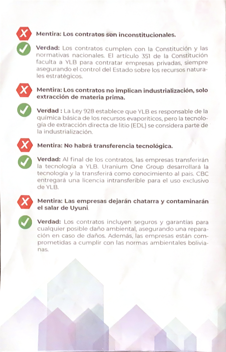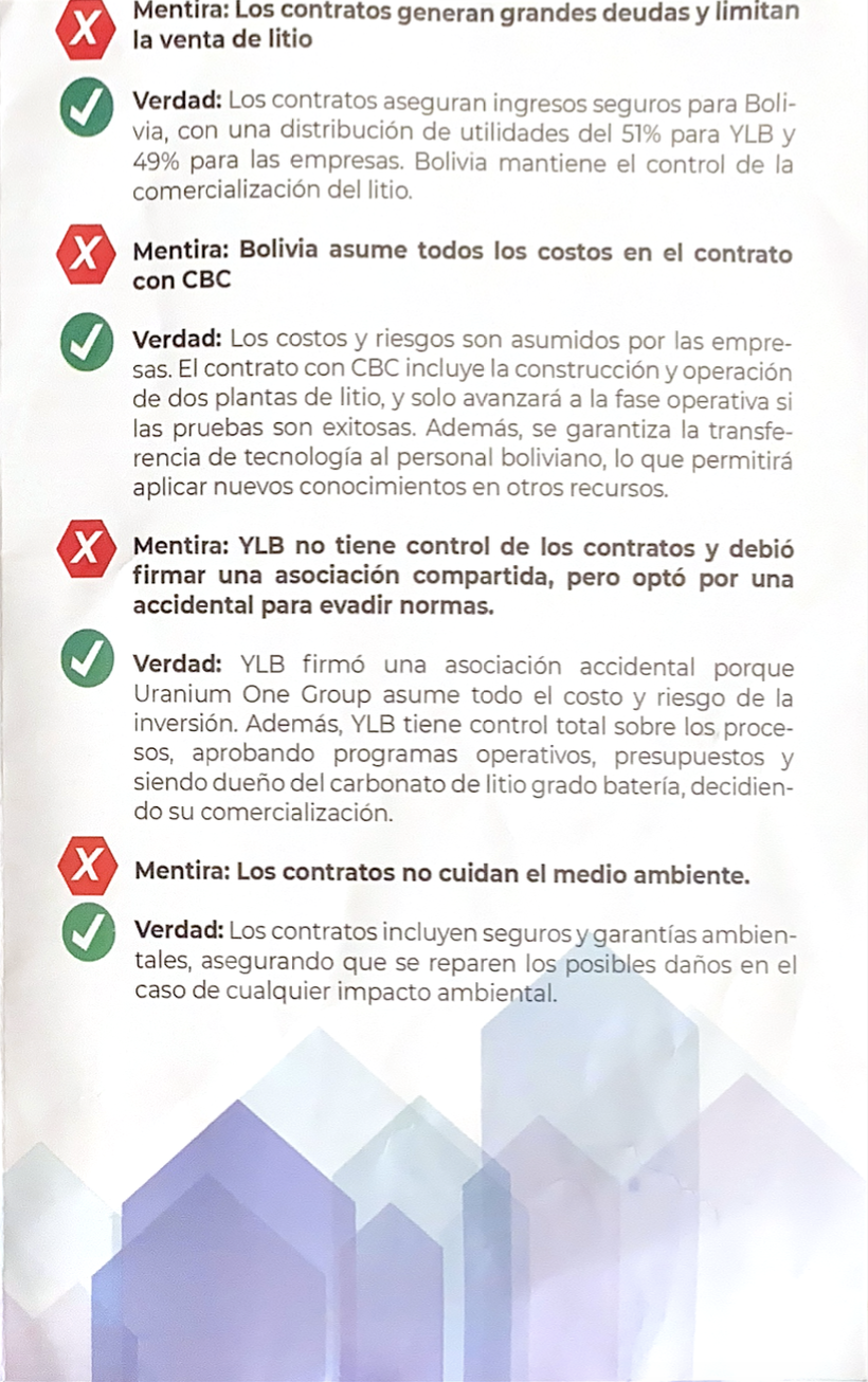 Antes de que iniciara la socialización me llegó a las manos una cartilla de YLB titulada “Verdades y mentiras sobre los contratos de litio”. Al revisar su contenido me quede perplejo por su argumentación poco prolija. En una de las 11 “mentiras y verdades” que tenía este panfleto se decía: “Mentira: no habrá transferencia de tecnología. Verdad: Al final de los contratos, las empresas transferirán la tecnología a YLB”.
