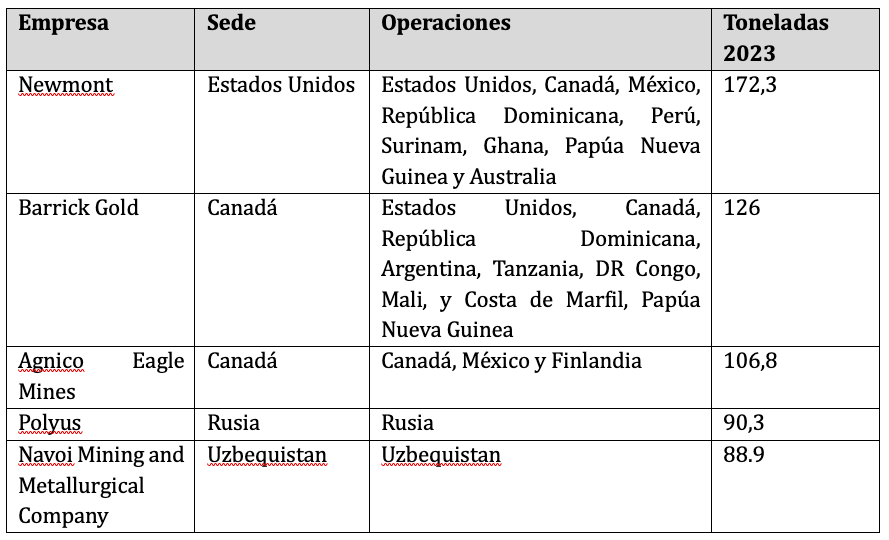 En este contexto, los altos precios han incentivado a personas de todo el mundo a insertarse, en los diferentes eslabones de la cadena de suministro del oro, también a empresas, transnacionales y países, se han sumado a participar. Los seis países con mayor producción en 2023 fueron China con 378 toneladas, Rusia con 321, Australia con 293, Canadá con 191, Estados Unidos con 166 toneladas y Ghana con 135. Por su parte, las empresas de minería a gran escala con mayor producción fueron: Newmont, Barrick Gold, Agnico Eagle Mines, Polyus, Navoi Mining and Metallurgical Company, una estadounidense, dos canadienses, una rusa y una uzbeka. Con operaciones en todos los continentes, pero con mayor presencia en Norte América y Asia Central (Investing News Network, 2024).