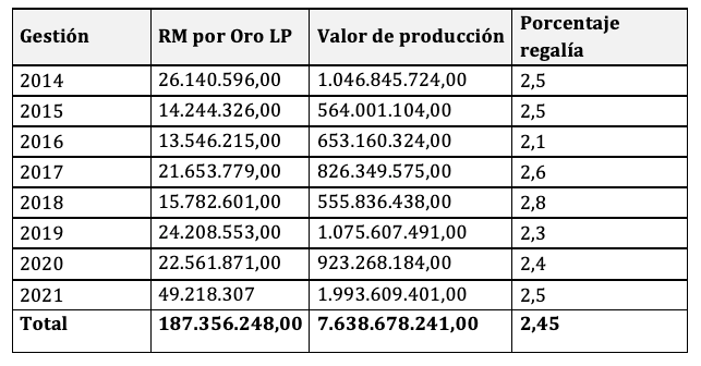 Los datos del Ministerio de Minería y Metalurgia de 2014 a 2021 muestran que el departamento de La Paz ha producido oro por un valor de más de 7 mil millones de dólares en ocho años, y por el actual régimen regalitario apenas ha percibido, en promedio, un 2,45% de regalías, provenientes de cooperativas y productores mineros como se puede ver en la tabla 10