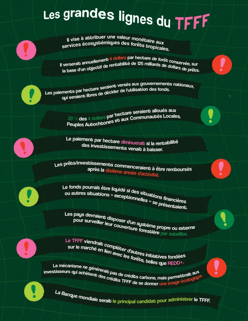 Les deux formulations du TFFF reconnaissent que si l’on ne parvient pas à mobiliser 125 milliards de dollars ou si le taux de rendement est inférieur à 7,5 %, le paiement par hectare pourrait être inférieur à 4 dollars ou même être « temporairement » suspendu. Cela confirme que payer pour les forêts conservées n’est pas une réponse cohérente avec l’importance des forêts, mais qu’il s’agit plutôt d’un jeu financier classique du système bancaire capitaliste.