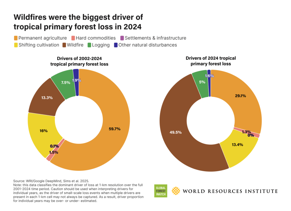 Actualmente los incendios se caracterizan por ser más duraderos debido a la sequía y altas temperaturas a causa del cambio climático, “lo que crea un bucle de retroalimentación de empeoramiento de incendios y emisiones de carbono”. La pérdida de cobertura arbórea global fue la más alta registrada en el 2024, aumentando un 5 % en comparación a datos del 2023 llegando a alcanzar los 30 millones de hectáreas fuera de los trópicos. Los incendios impulsaron aún más la pérdida de cobertura arbórea y fueron especialmente notorios en Canadá y Rusia.