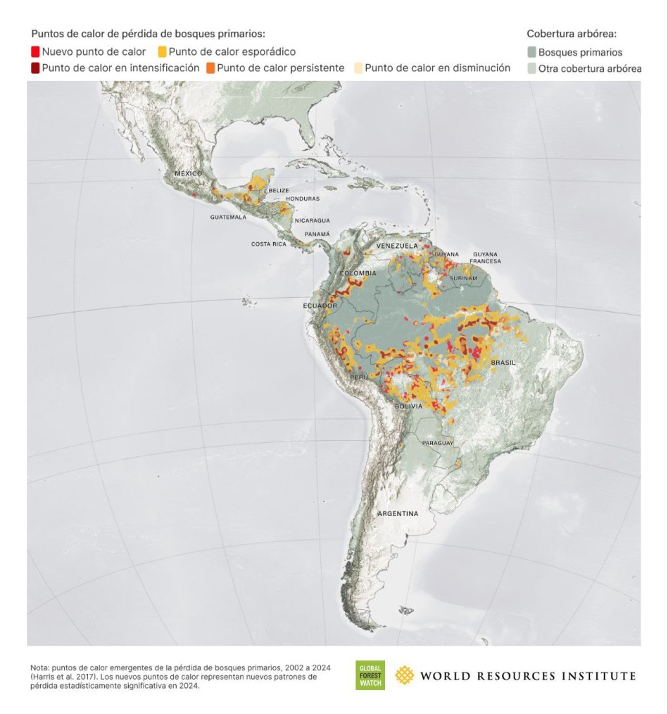 Los puntos de calor muestran áreas en América Latina que fueron afectadas recientemente por incendios en el 2024 (Imagen de Forest Pulse)