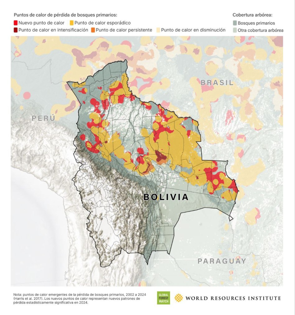 Los puntos de calor de la pérdida de bosques primarios en Bolivia entre 2002 y el 2024 muestran la expansión de los frentes de pérdida de bosques en todo el país (Imagen de Forest Pulse)