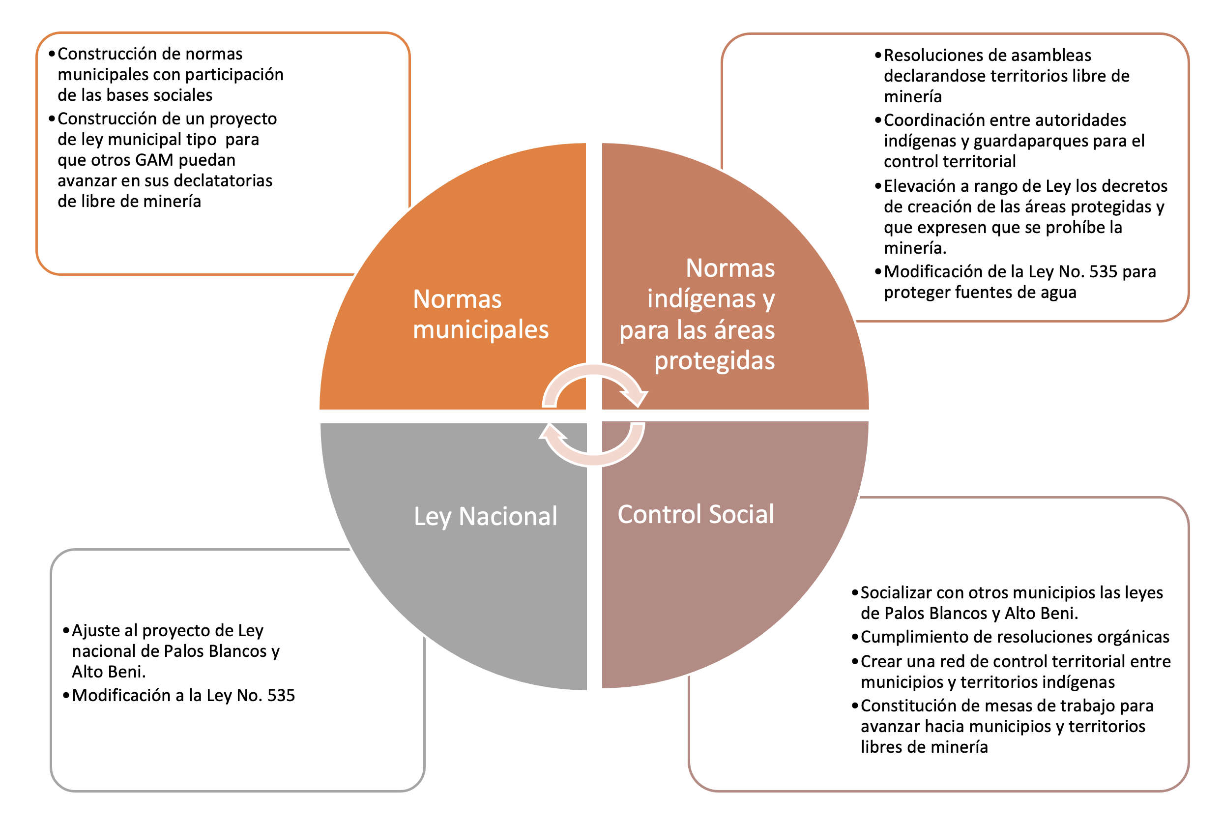 En cuanto a Palos Blancos y Alto Beni, la ruta implica al menos tres acciones: La primera, analizar la incorporación de un ajuste al proyecto de Ley nacional de declaratoria de municipios libres de minería, para incluir una modificación de la Ley No. 535 respecto a las restricciones de las actividades mineras. La segunda, insistir con la AJAM para que proceda con la restricción de las actividades mineras en sus jurisdicciones como manda la acción popular de Palos Blancos y; la tercera, avanzar en la operatividad de las leyes municipales promulgadas así como en la declaratoria del territorio mosetén como espacio libre de minería.