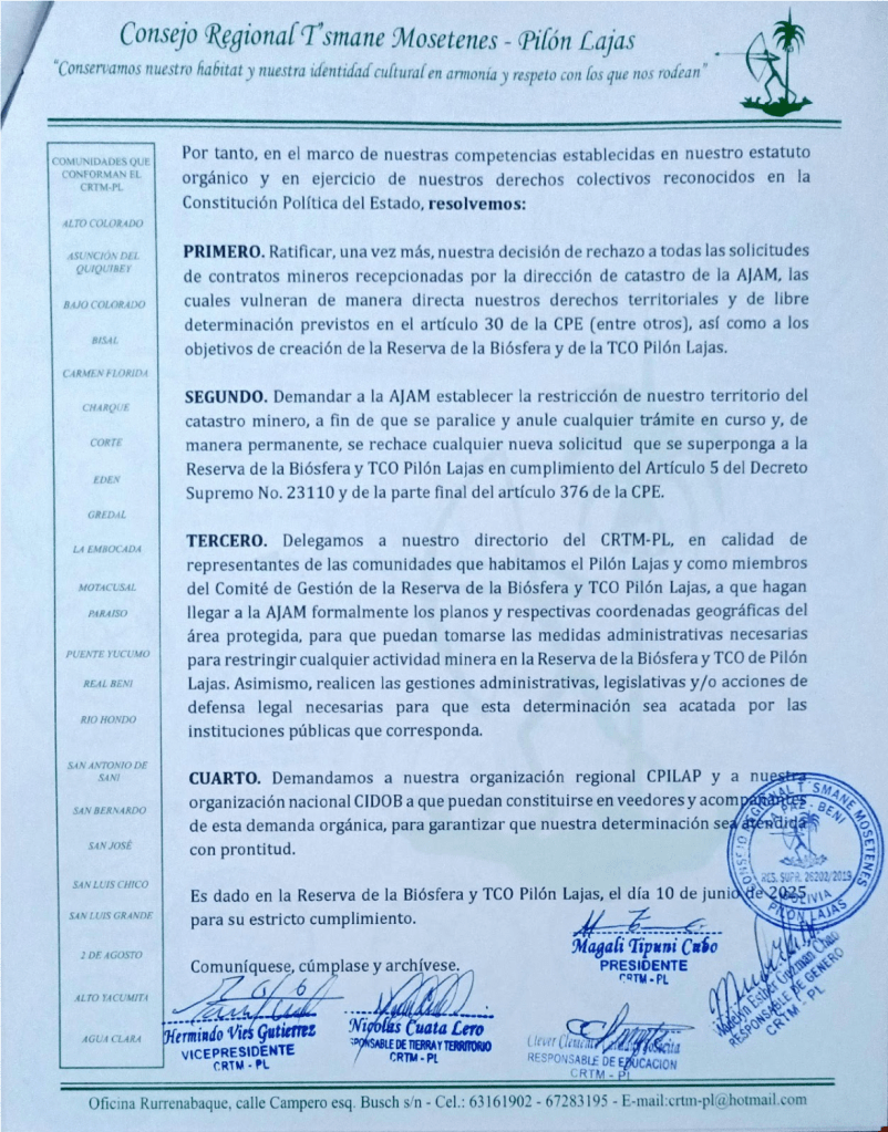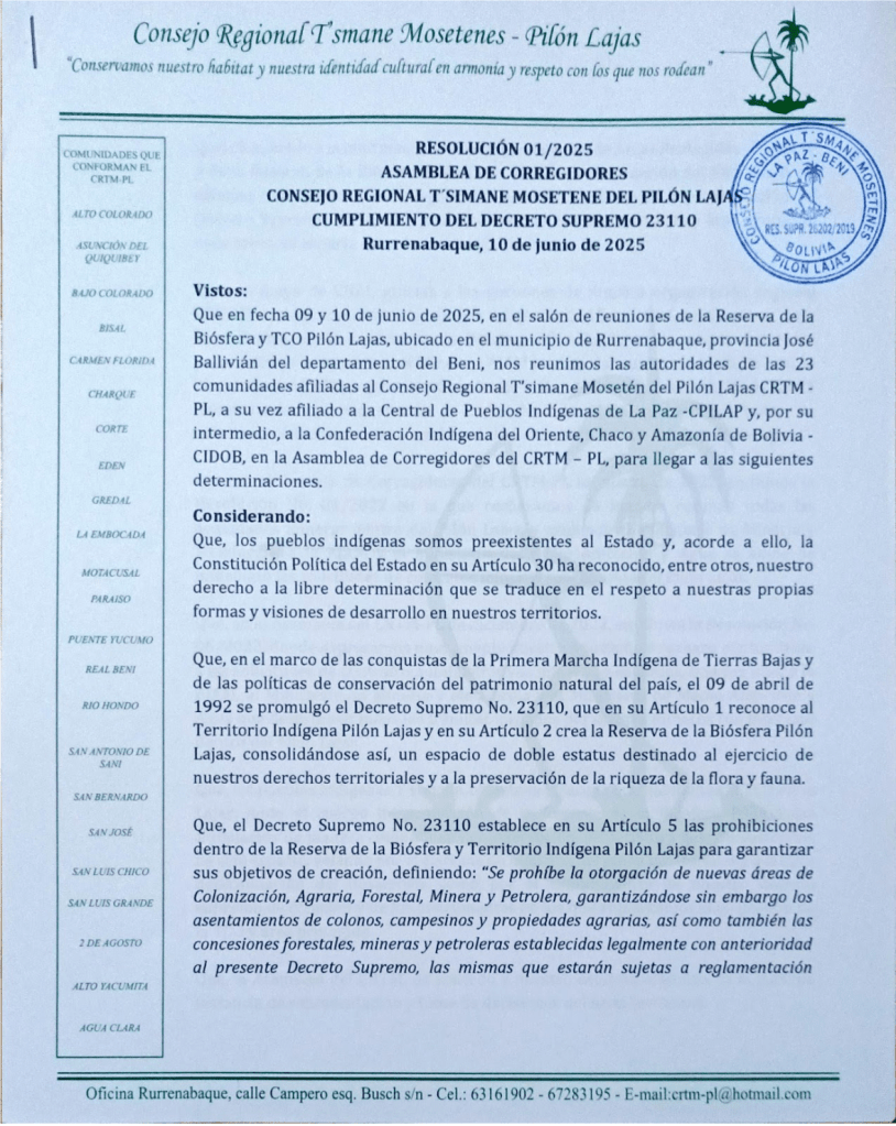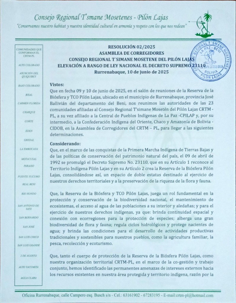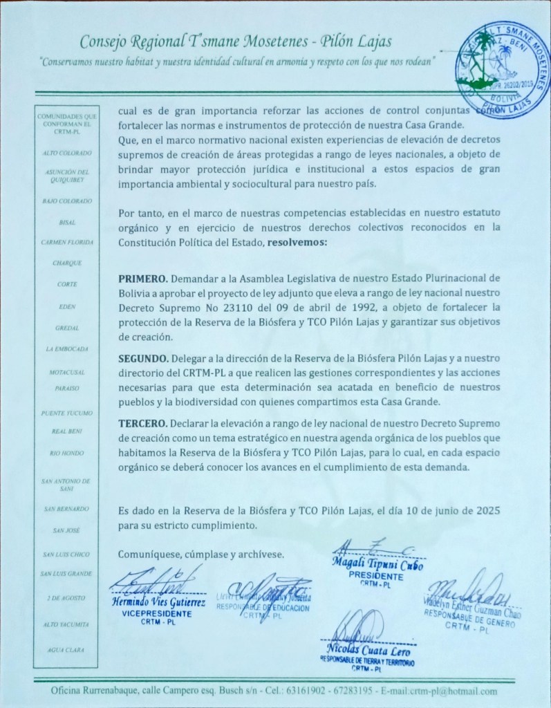 El respaldo a las propuestas del CRTM-PL de declarar al Pilón Lajas como territorio libre de actividad minera, elevar al rango de ley nacional el Decreto Supremo 23110, y consolidar el protocolo de consulta previa territorial, da cuenta de una decisión colectiva que fue ratificada en la Asamblea de Corregidores del 9 y 10 de junio de 2025..