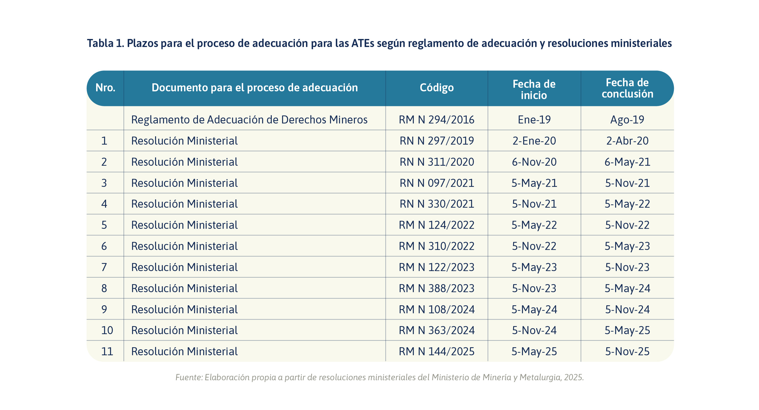 Estas dos primeras ampliaciones sentaron el precedente para otras ocho resoluciones posteriores, todas emitidas bajo una lógica permisiva y complaciente hacia los actores mineros con derechos preconstituidos. En total, fueron once resoluciones ministeriales consecutivas (ver tabla 1) que extendieron los plazos de adecuación, siendo la última aprobada en mayo de 2025 y fijando como fecha límite noviembre del mismo año. Todas ellas beneficiaron no solo a los titulares de ATEs, sino también a la propia AJAM, al permitirle justificar su inacción y falta de operatividad administrativa mediante mecanismos formales de un proceso que la misma institución diseñó.