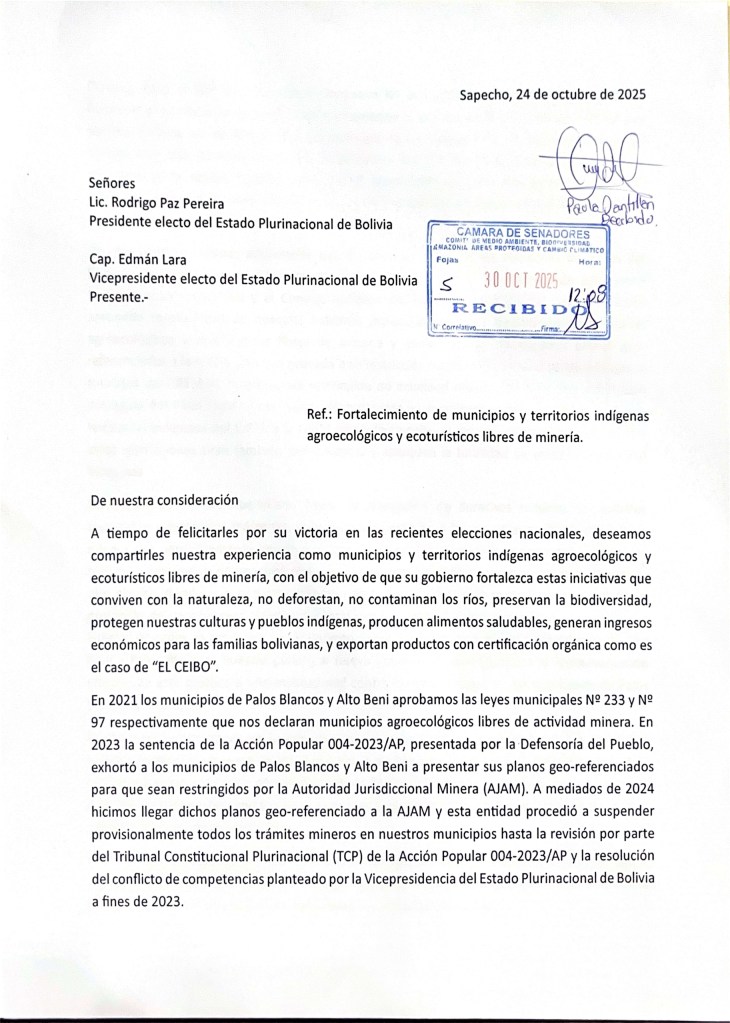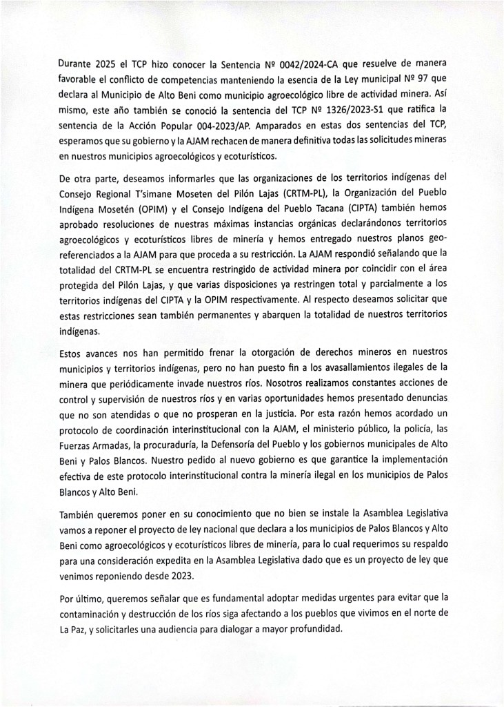A través de una carta dirigida a los nuevos mandatarios electos Rodrigo Paz y Edman Lara, los Municipios de Palos Blancos y Alto Beni, junto con organizaciones indígenas como el Consejo Regional T’simane Moseten del Pilón Lajas (CRTM-PL), la Organización del Pueblo Indígena Mosetén (OPIM), la Organización de la Mujer Indígena Mosetén (OMIM) y el Consejo Indígena del Pueblo Tacana (CIPTA) del Norte de La Paz, dan a conocer su decisión de preservar su modelo agroecológico y libre de actividad minera, dentro de sus jurisdicciones.