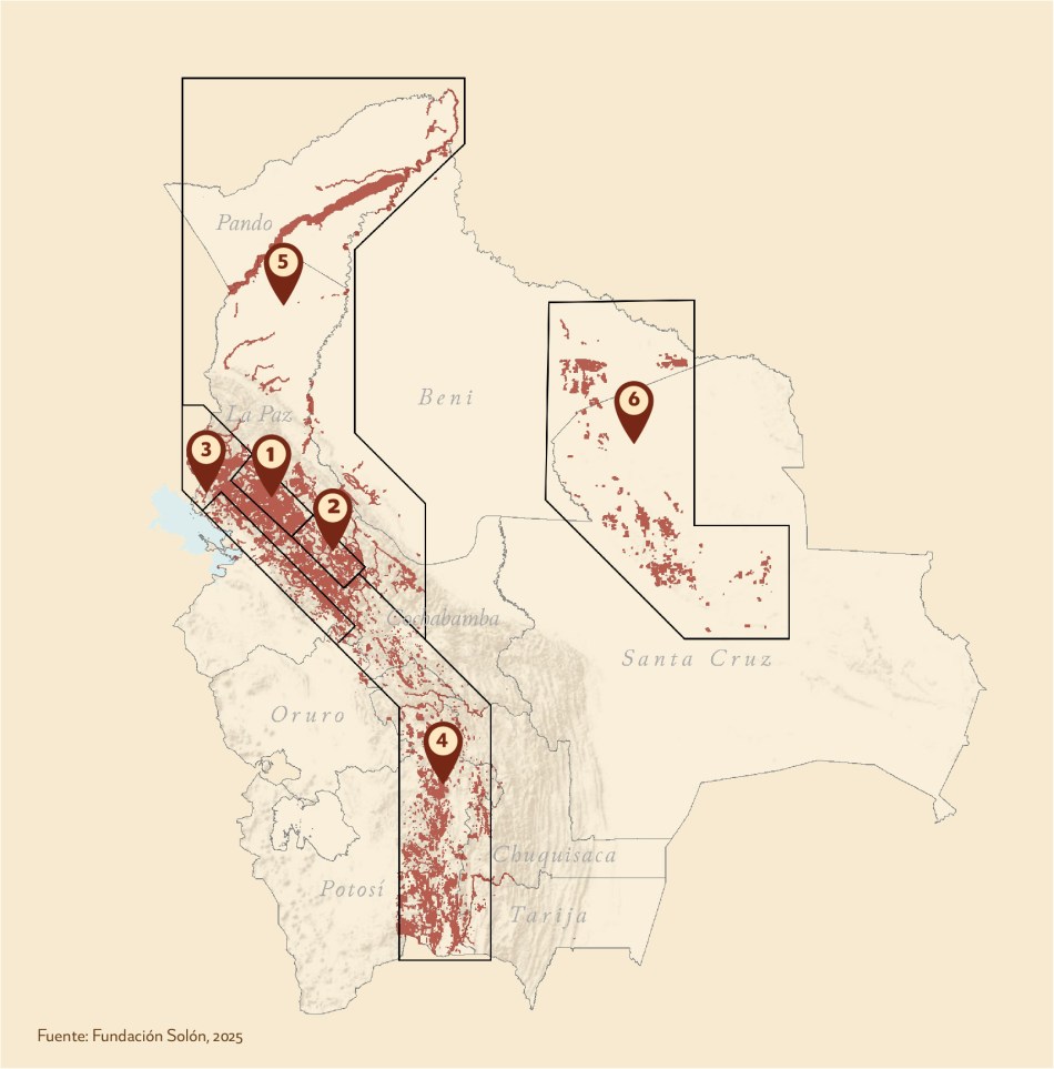 La expansión de la minería aurífera en Bolivia no ha sido un proceso uniforme, sino que ha seguido distintos patrones territoriales y temporales. La Ley N.º 535 de Minería y Metalurgia (2014) reconoce la minería como una actividad estratégica para la economía nacional (Art. 8) y regula los derechos mineros de los diferentes actores productivos (estatales, privados y cooperativistas). En este marco, el desarrollo del sector aurífero ha tomado diversas rutas de consolidación y expansión en el territorio nacional, que pueden sintetizarse en seis sectores: