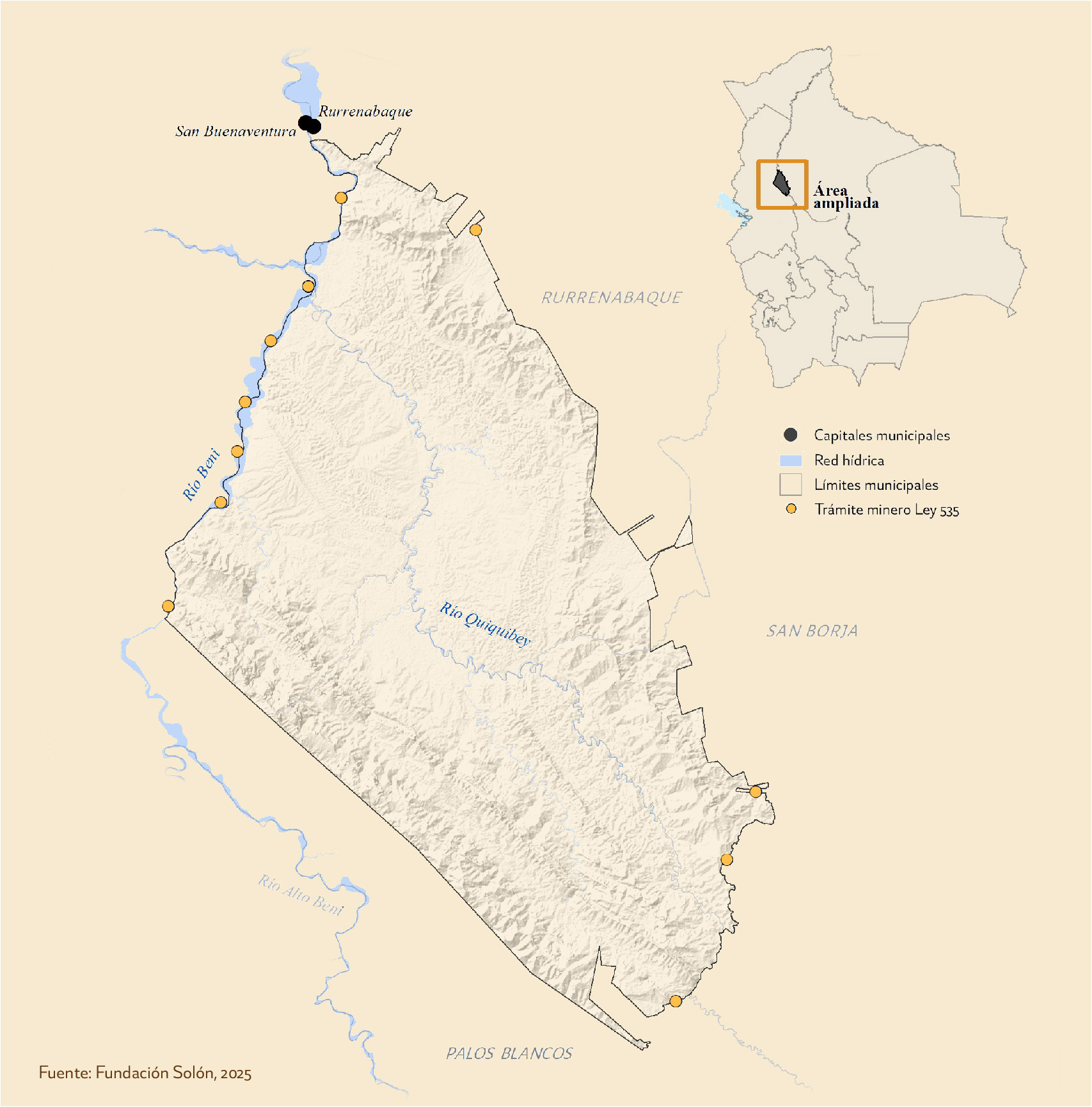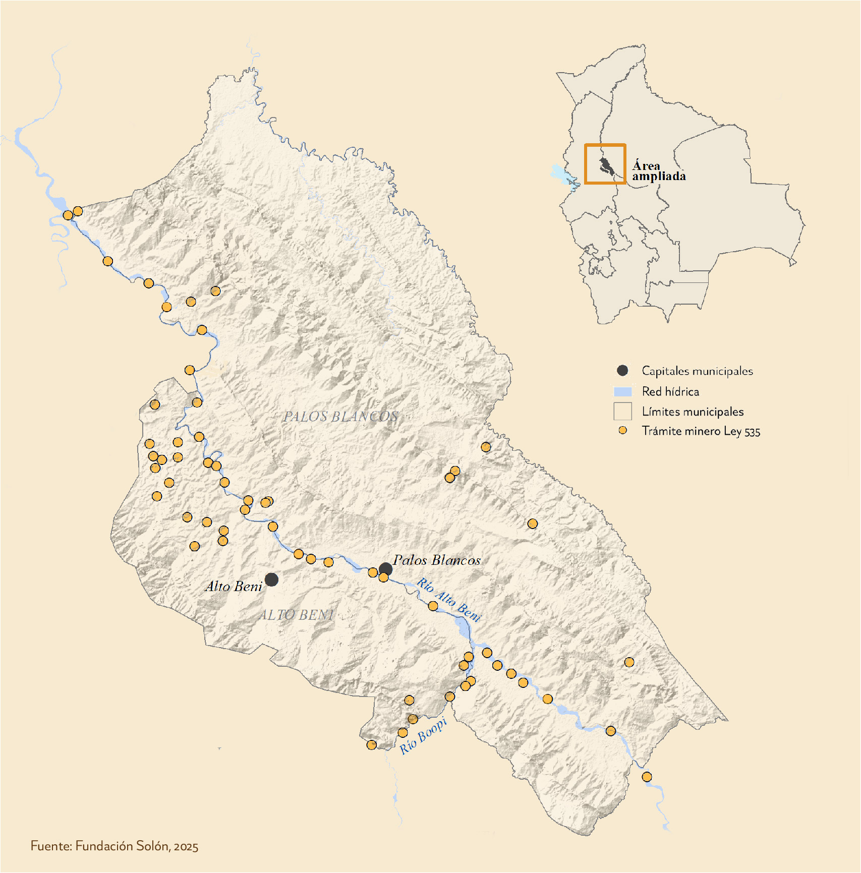 Palos Blancos y Alto Beni se declararon libres de minería en 2021 a través de las leyes municipales No. 233 y 097 respectivamente Antes, ya se había registrado la presencia de diversos actores interesados en la explotación del oro. Entre estos actores se encontraban tanto cooperativas mineras como empresas privadas que, previendo los posibles beneficios de la actividad, iniciaron trámites de solicitud de contratos mineros como una manera de reservar espacios para futuras operaciones extractivas, sin necesariamente garantizar su ejecución inmediata.