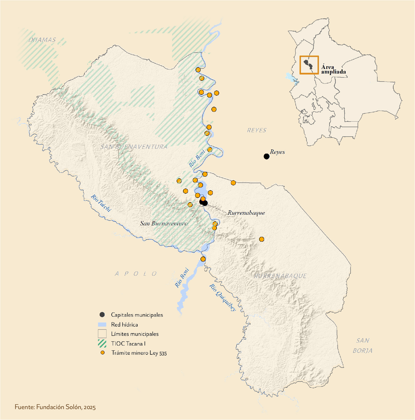 El análisis de los registros de trámites mineros presentados ante la Autoridad Jurisdiccional Administrativa Minera (AJAM) muestra que hasta 2025 hay 20 solicitudes en curso, en su mayoría vinculadas a operadores privados. Estas solicitudes se ubican principalmente en los bordes de los territorios indígenas Tacana I, del rio Beni y del río Tequeje, lo que aumenta el riesgo de conflictos por el uso del espacio y de los bienes comunes.