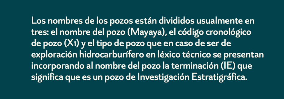 Los nombres de los pozos están divididos usualmente entres: el nombre del pozo (Mayaya), el código cronológicode pozo (X1) y el tipo de pozo que en caso de ser deexploración hidrocarburífero en léxico técnico se presentanincorporando al nombre del pozo la terminación (IE) quesignifica que es un pozo de Investigación Estratigráfica.