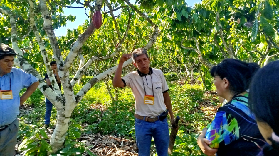 Durante la visita, las y los participantes del Encuentro conocieron las bondades de las parcelas con agroforestería dinámica, las cuales se basan en principios de colaboración entre especies vegetales y pueden implementarse con cultivos principales distintos al cacao, según la región e intereses del productor.