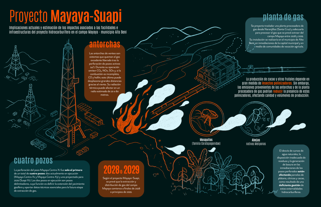 El gobierno de Luis Arce Catacora presentó el campo gasífero Mayaya como una esperanza para enfrentar la crisis energética del país sin tomar en cuenta los posibles impactos que podía tener para la producción agroforestal de Alto Beni. Toda la propaganda se redujo a mencionar que se habían descubierto 1,7 Trillones de Pies Cúbicos (TCF en inglés) de gas en Mayaya. El entonces presidente de YPFB, Armin Dorgathen, estaba más preocupado en anunciar una inversión de 403 millones de dólares y la extracción del “First Gas” para inicios de 2029, que en considerar los posibles impactos que podría traer esta explotación hidrocarburífera en esta región de exuberante biodiversidad y corazón de la producción agroecológica del cacao.