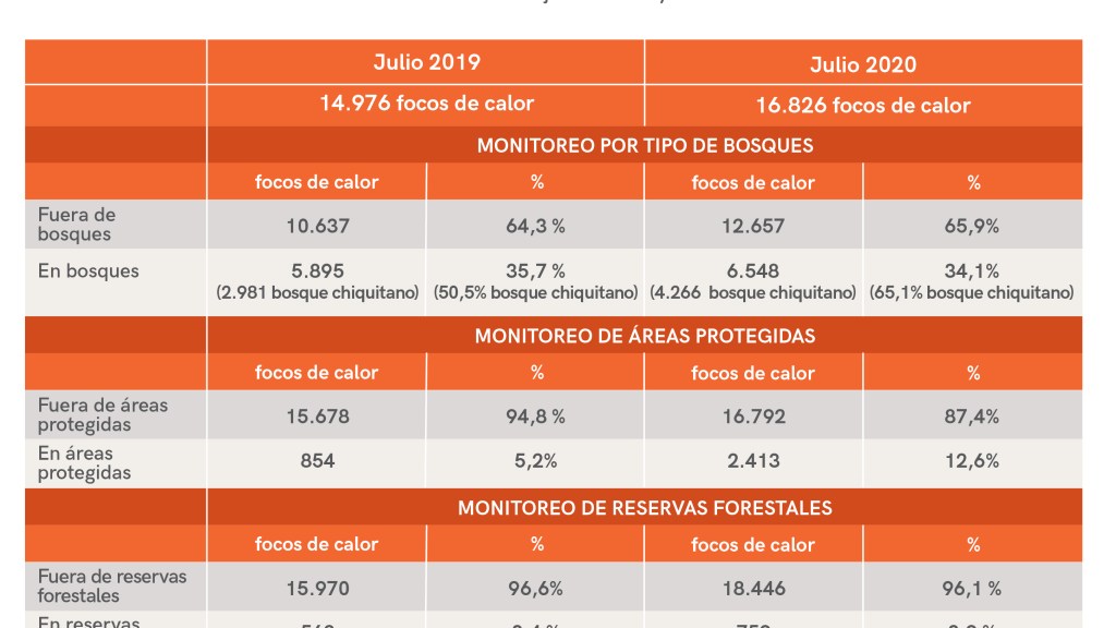 Julio del 2020: más incendios en Áreas Protegidas y en el bosque Chiquitano que el 2019