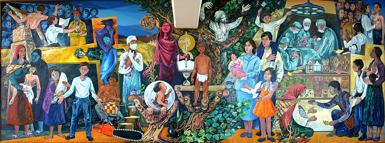 Los brazos del Che se confunden con las ramas del árbol de la vida. De la tierra brotan dos manos. Una sostiene un niño a punto de nacer y en la otra un niño indígena nos interpela con la mirada. A la derecha, la muerte, las masacres, la angustia, los cementerios… a la izquierda la lucha por la vida, la medicina kallahuaya, la medicina occidental, los comités populares de salud y una familia. Unos árboles talados nos recuerdan que la salud humana es impensable sin la salud de la madre tierra. En las tinieblas… los mercaderes de la medicina. Todas las imágenes tienen color menos una: el Cristo de La Higuera. Así se llama el mural que Solón pintó en 1995 en la facultad de medicina de la Universidad Mayor de San Andrés de La Paz.