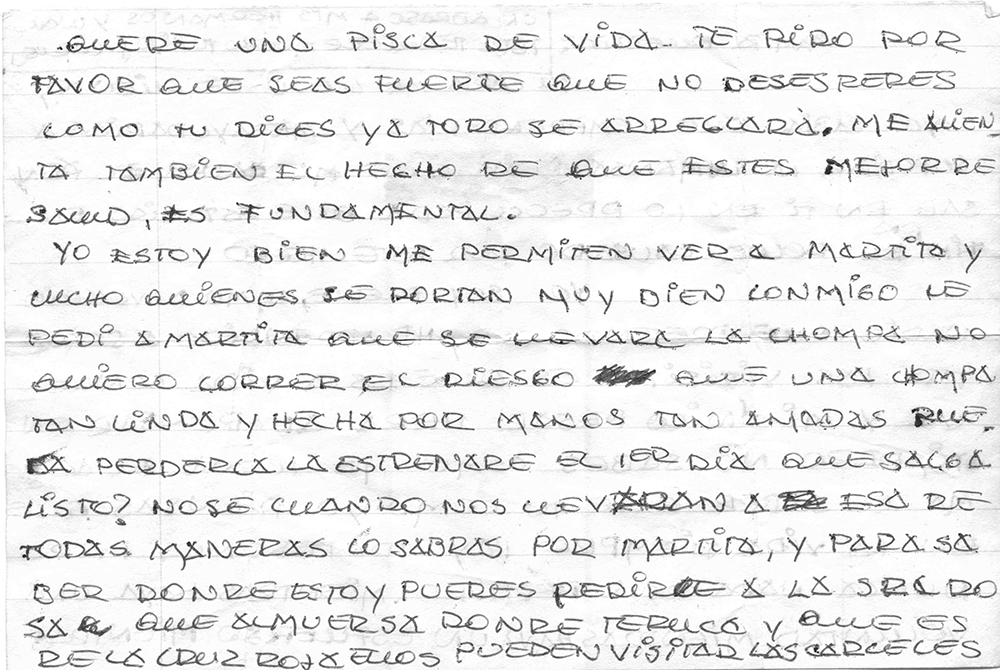 Yo estoy bien. Me permiten ver a Martita y Lucho, quienes se portan muy bien conmigo. Le pedí a Martita que se llevara la chompa. No quiero correr el riesgo de que una chompa tan linda y hecha por manos tan amadas pueda perderla. La estrenaré el primer día que salga. ¿Listo? No sé cuándo nos llevarán a ésa [La Paz]; de todas maneras lo sabrás por Martita…Un brazo a mis hermanos y Walter. Te quiere mucho tu hijo.
